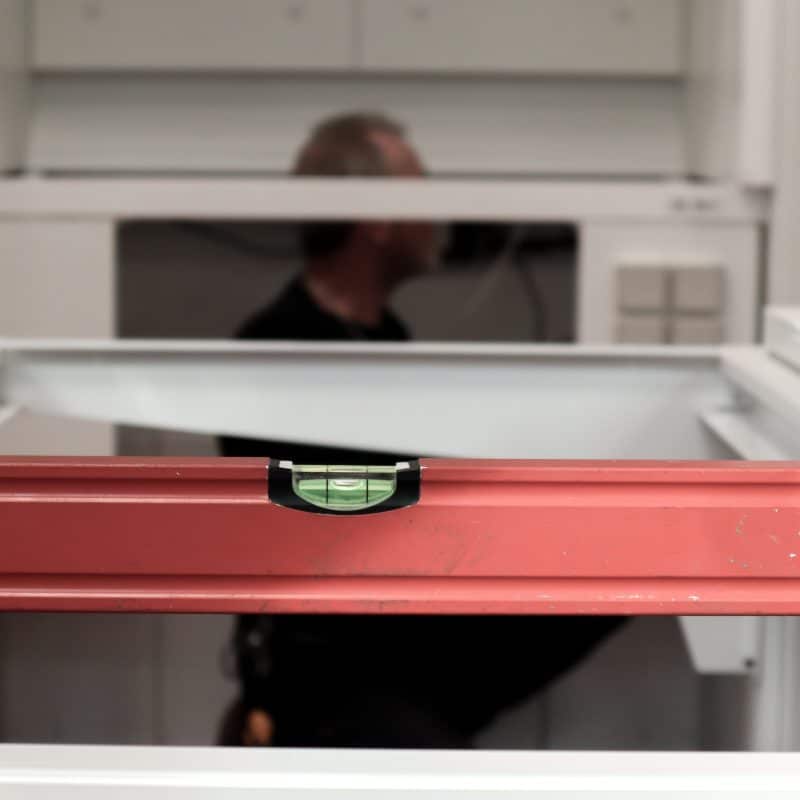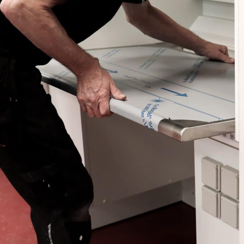 Laboratorieløsningerne omfatter flere højdejusterbare stinkskabe med rustfrit 316 stål, punktudsugning, kemikalieskabe og opstillinger med laboratorieborde og installationsbroer.